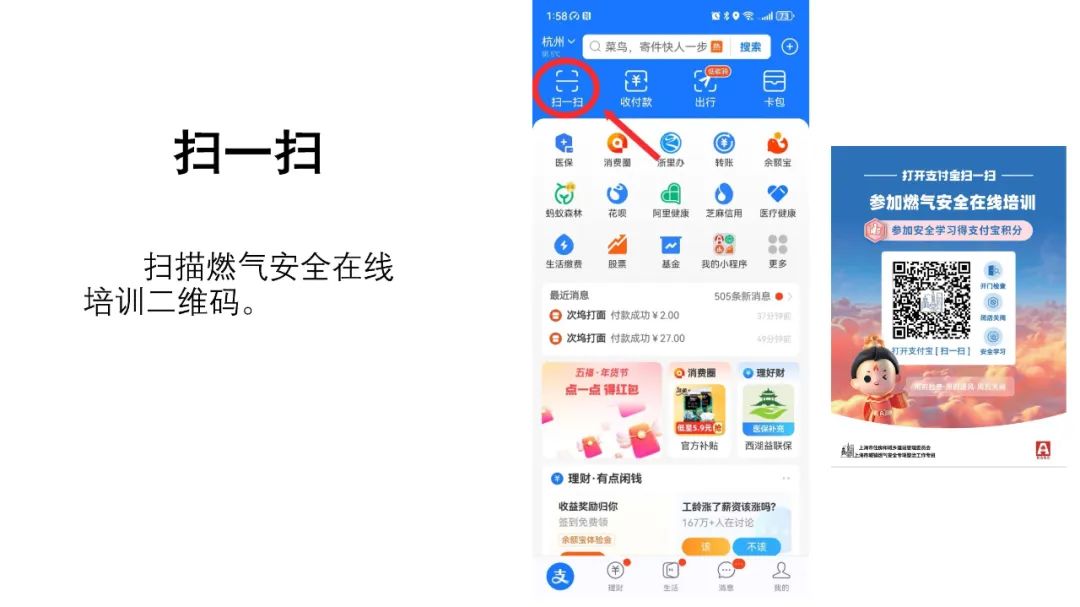 用户通过支付宝扫描下方的二维码即可进入活动页面。点击“餐饮负责人在线学习培训”活动,授权后参加线上培训,根据用气类型选择:管道燃气用户或瓶装燃气用户,在线观看3门安全教育课程及2部安全警示教育片,看完所有培训视频并取得证书即完成此次培训。
