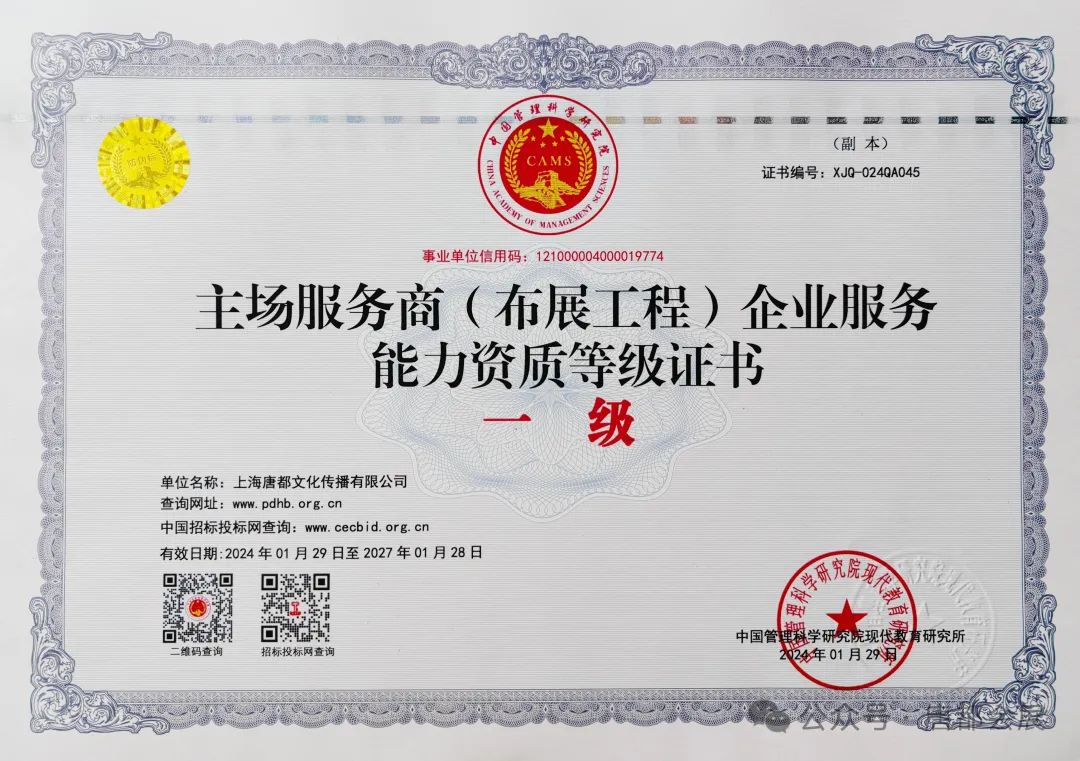 恭喜唐都会展荣获主场服务商(布展工程)企业服务能力资质一级证书。