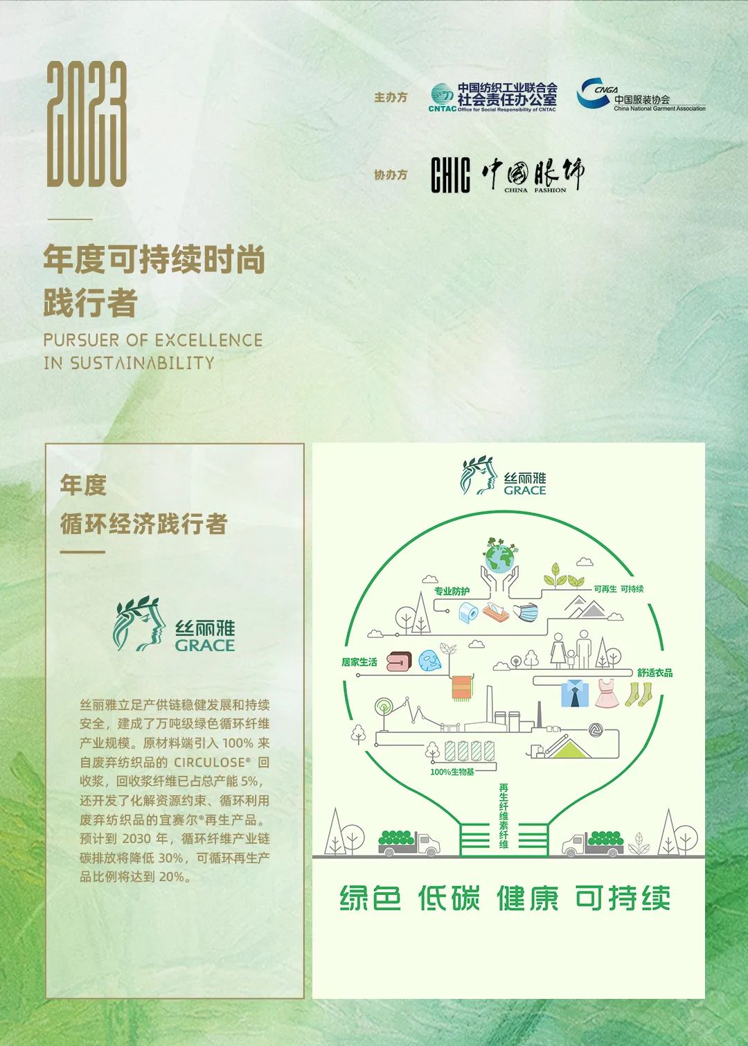 作为纺织产业的龙头企业之一,丝丽雅以“用创新创造美好生活”为愿景,以“绿色、低碳、健康、可持续”为锚点,在再生纤维素纤维领域持续精耕,始终致力于以科技和创新引领行业进步。今年以来,丝丽雅喜讯不断、捷报频传,公司获评中国化纤协会2023年度“先进会员企业” “2023中国纺织服装行业年度精锐榜——十大可持续发展榜样” “2023可持续时尚践行者——年度循环经济践行者”等奖项。