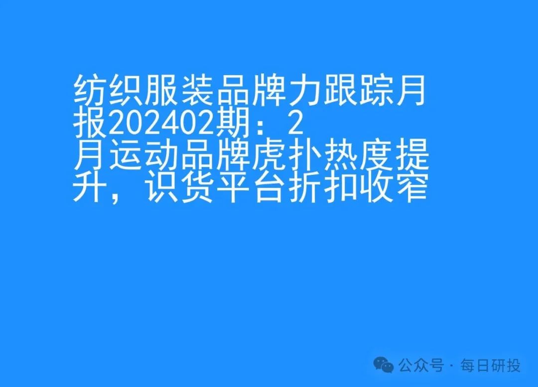 关于这篇:《纺织服装品牌力跟踪月报202402期:2月运动品牌虎扑热度提升,识货平台折扣收窄》,有需要的小伙伴可关注并仔细阅读报告原文~