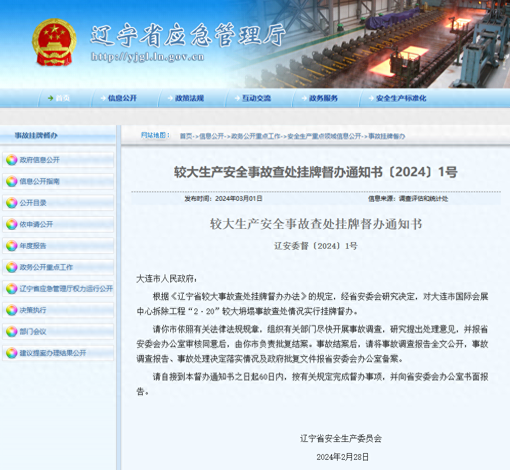 近日,据辽宁省应急管理厅网站消息,根据《辽宁省较大事故查处挂牌督办办法》的规定,经省安委会研究决定,对大连市国际会展中心拆除工程“2·20”较大坍塌事故查处情况实行挂牌督办。