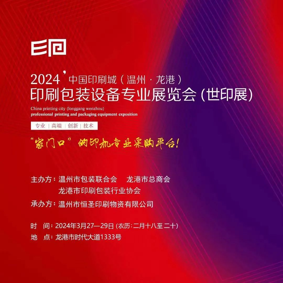 2024年中国印刷城(温州·龙港)印刷包装设备专业展览会(世印展)已蓄势待发、即将启幕!此次展览会将汇聚业内顶尖的印刷包装设备及相关技术,为行业内的专业人士提供一个交流、学习、合作的重要平台。被本地印刷包装企业广泛称之为“家门口”的印机专业采购平台!为了推进印刷包装业重塑提升,助推龙港市省级“印艺小镇”创建,第八届中国印刷城(温州•龙港)印刷包装设备专业展览会将于2024年3月27-29日在龙港市时代大道1333号举办。展会由温州市包装联合会、龙港市总商会和龙港市印刷包装行业协会主办,温州市恒圣印刷物资有限公司承办。采取政府支持、行业参与、企业市场化运作模式,力争办成定位明确、服务行业、顾全大局的地方性专业特色印刷包装机械设备展会。