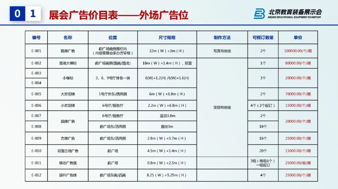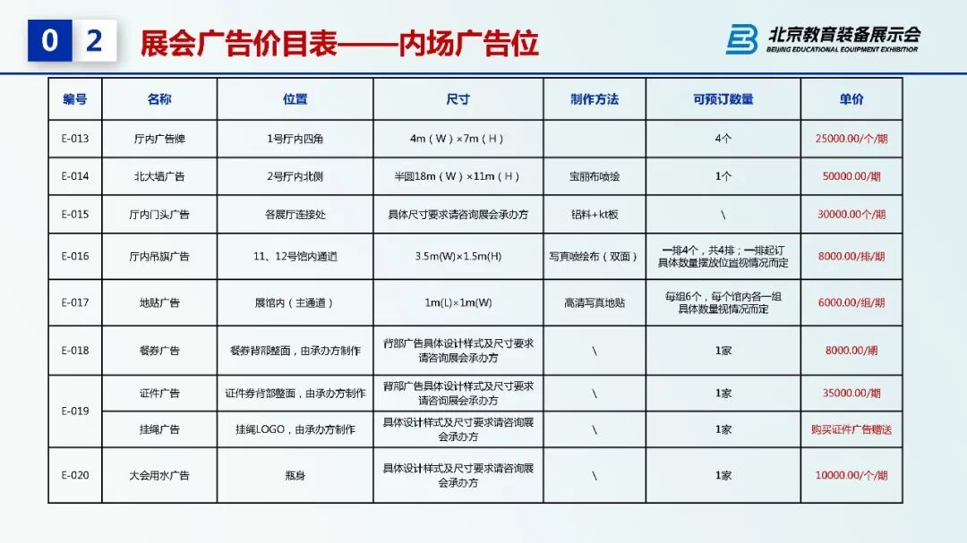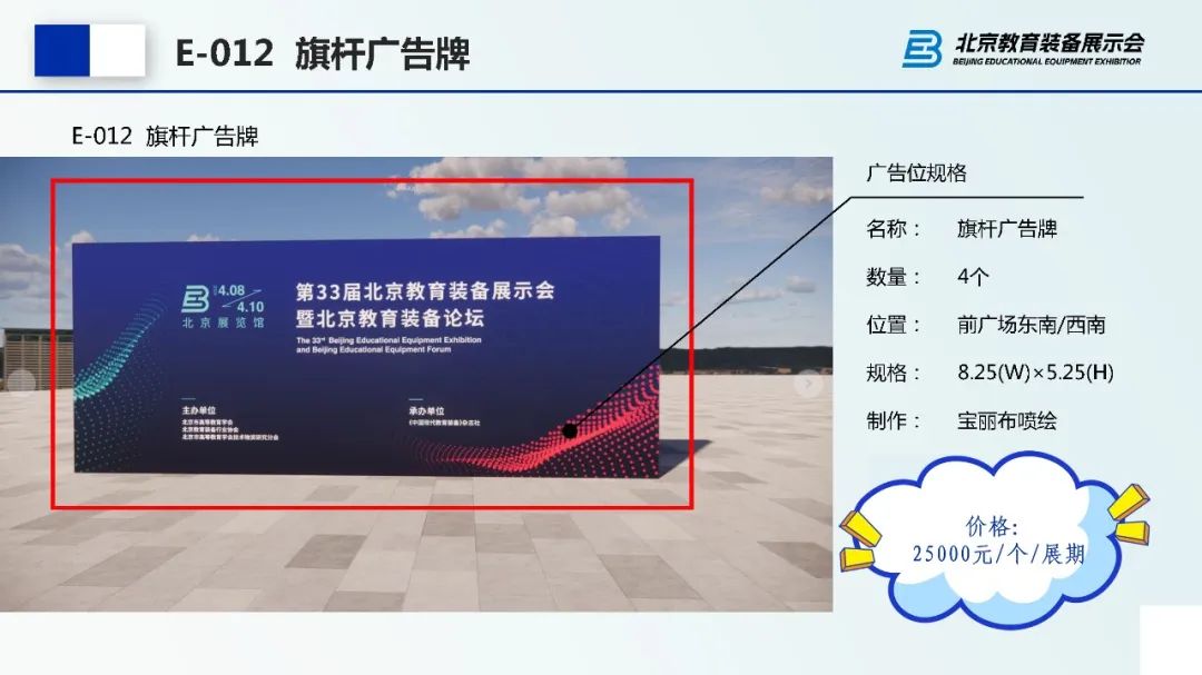 由北京市高等教育学会、北京教育装备行业协会、北京市高等教育学会技术物资研究分会主办,《中国现代教育装备》杂志社承办的第33届北京教育装备展示会暨北京教育装备论坛将于2024年4月8—10日在北京展览馆召开。现公布本届展会现场广告位方案,启动面向全部参展企业的广告招商工作,请意向企业及时联系广告招商负责人。