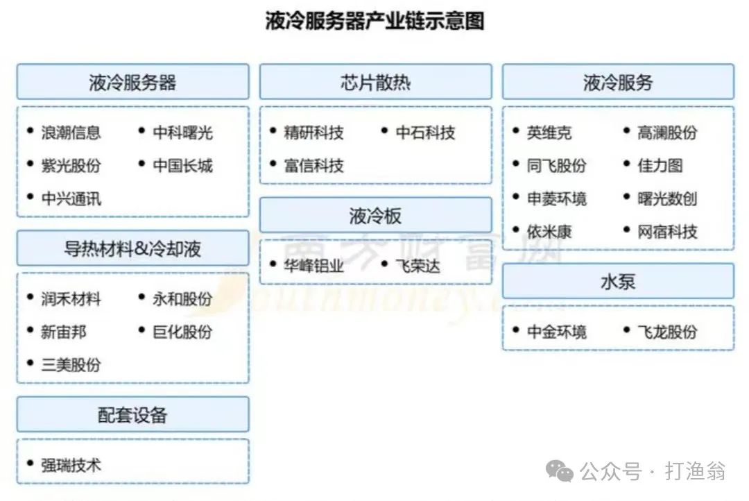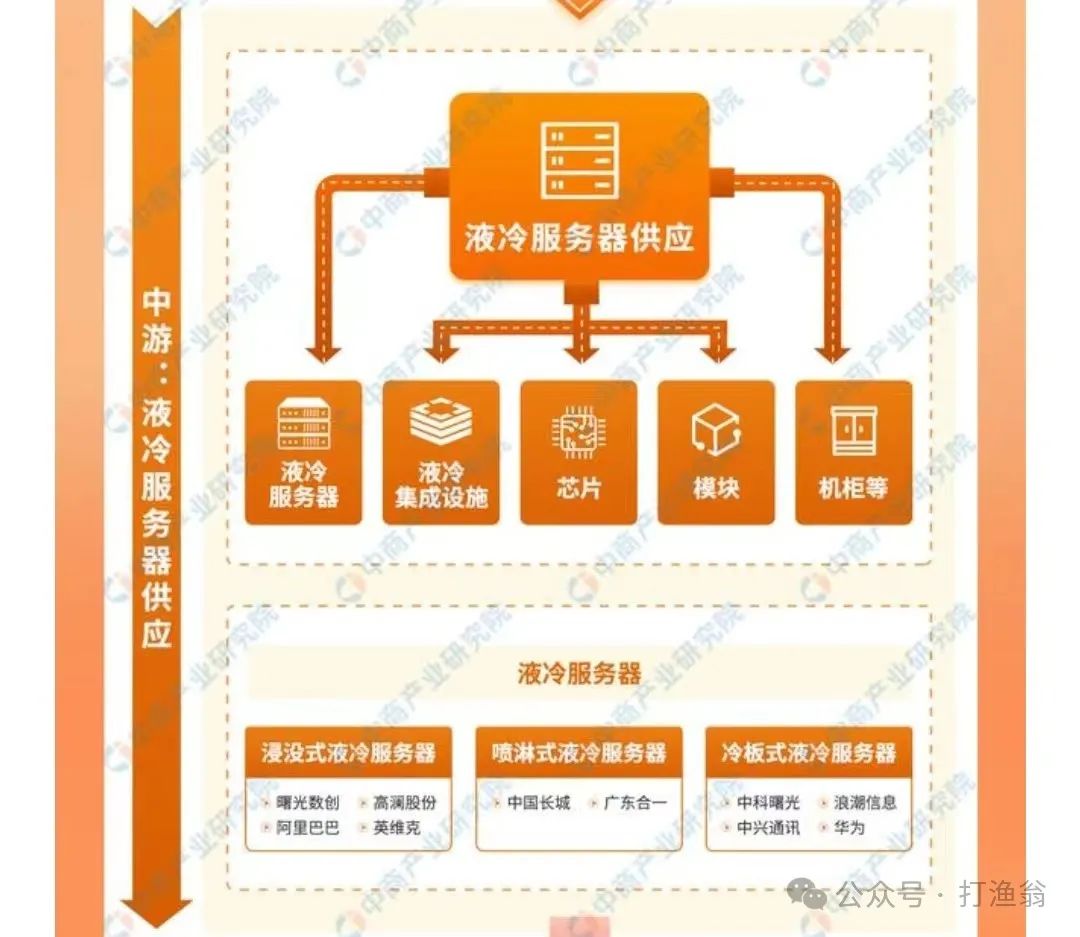 液冷服务器产业链包含液冷服务器、芯片散热、液冷服务、导热材料&冷却液、液冷板等环节。
