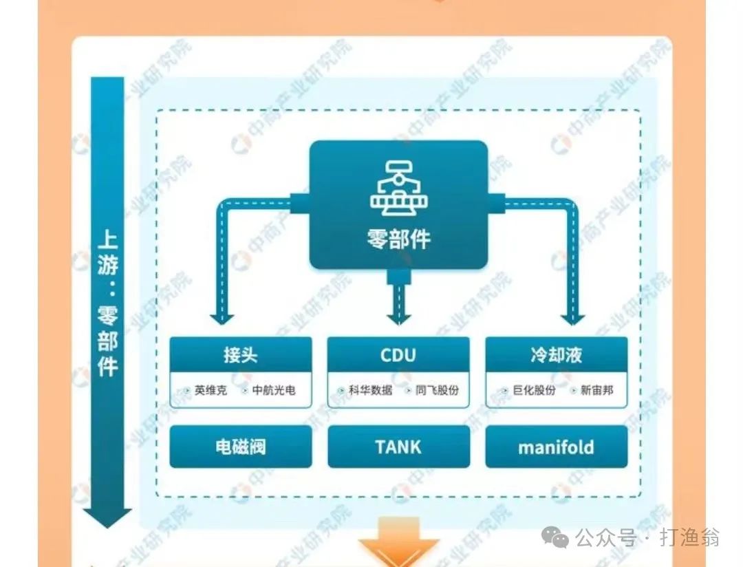 液冷产业链包括上游的产品零部件及液冷设备,中游的液冷服务器、芯片厂商以及液冷集成设施、模块与机柜等,下游的算力使用者。