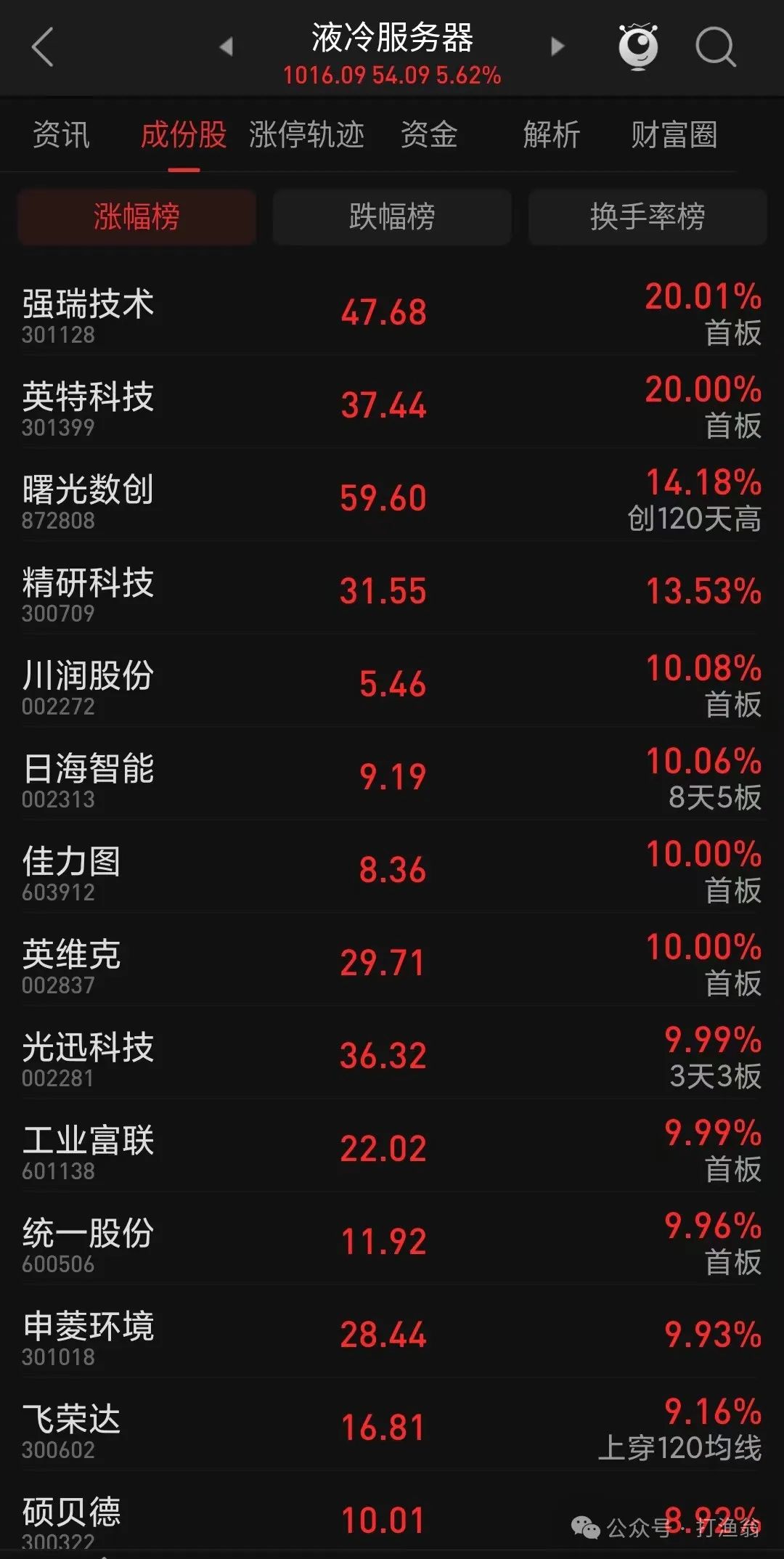 近日,液冷产业链相关的上市公司股价集体飙升,开启了涨停热潮,这反映出市场对液冷技术未来广阔前景的高度期待与肯定。随着5G、云计算、人工智能等高科技产业的深入发展,液冷技术将在数据中心、超级计算机等领域扮演越来越重要的角色,其产业链将迎来前所未有的发展机遇,市场潜力巨大,值得大家密切关注。