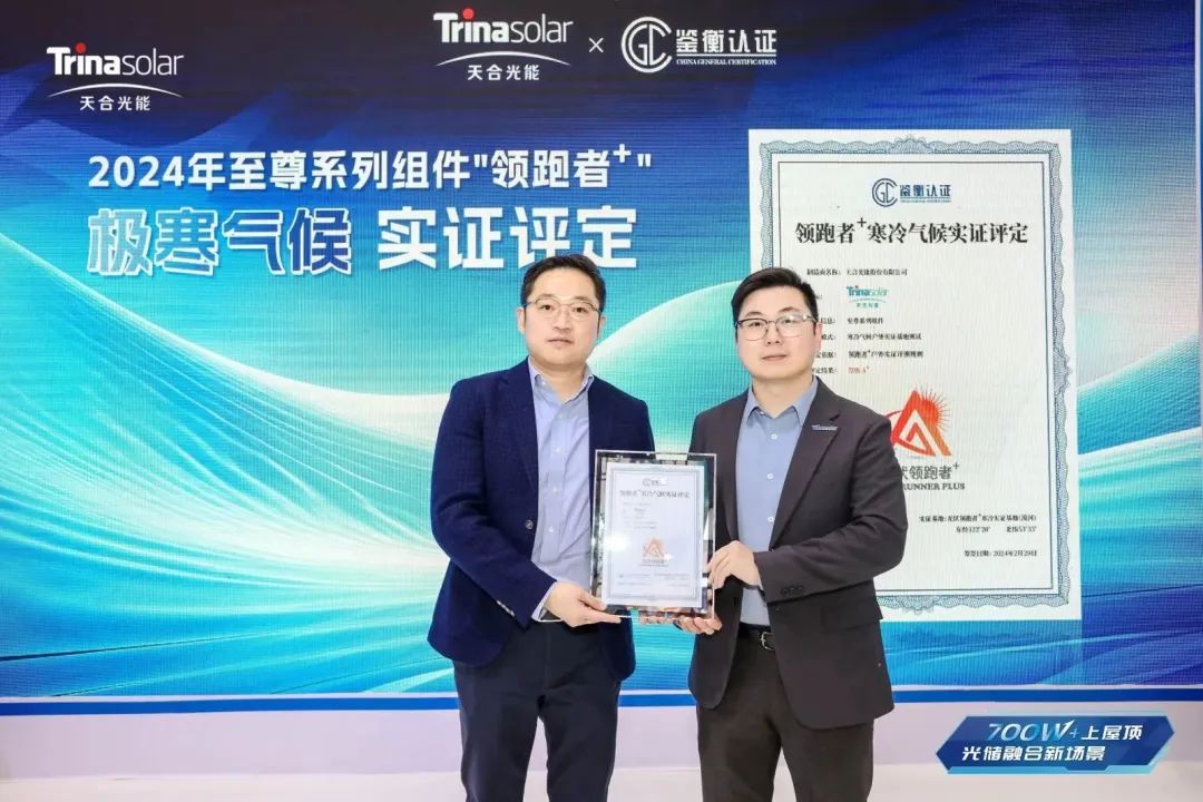 本次展会现场,鉴衡认证太阳能事业部总经理周罡为至尊系列组件极寒气候户外测试授证,天合光能中国区产品及市场总监唐正恺出席授证仪式。