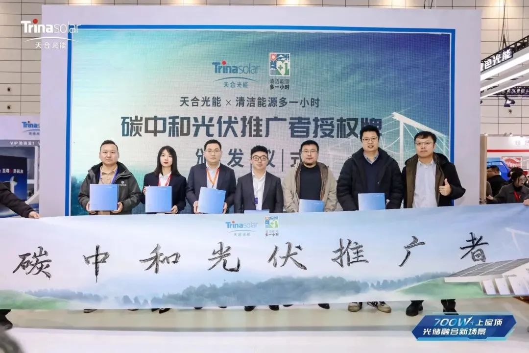 在今年的1月12日,天合光能发布了一个地球自然基金会“清洁能源多一小时”推广活动共创计划,本次展会现场天合光能中国区分销总经理王建龙为6家生态合作伙伴颁发由100%废塑料再生板材制作的“碳中和光伏推广者”奖杯。作为行业领军企业,天合光能将与各界同仁携手合作,拥抱绿色转型大时代,为实现碳中和的美好愿景而共同努力!