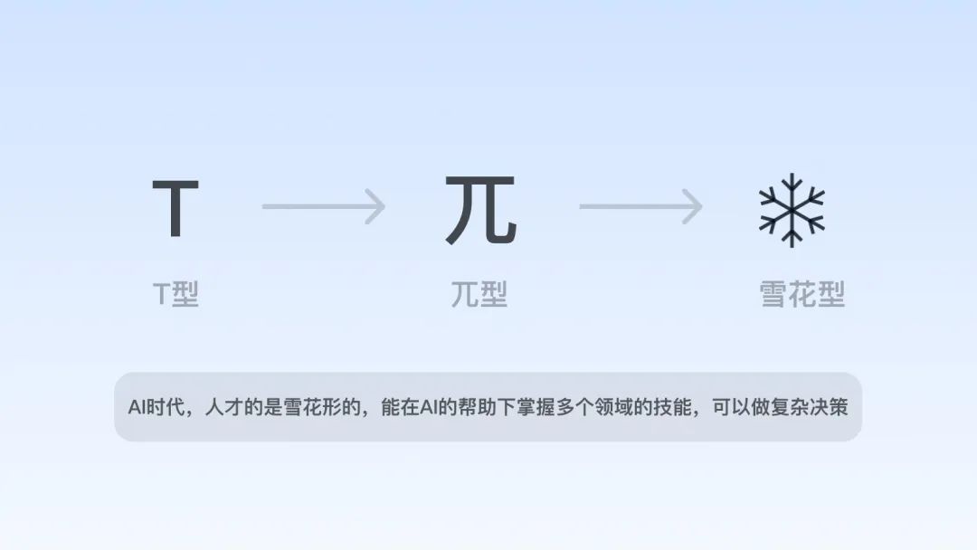 - 在人工智能时代,部分重复性、初级的设计需求将被替代,设计师乃至互联网职场人的能力维度将随之会有所改变,善用AI的综合能力素养变为刚需,在能力维度上接近于“雪花型”。