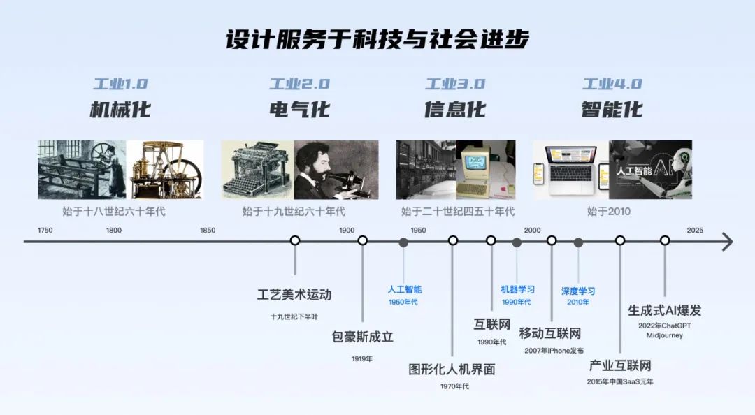 从历史角度来看,设计是服务于科技和社会进步的,每一次技术的发展社会的变革,势必带来设计形态的改变,从两次工业革命到信息化、智能化时代,每个周期内都会衍生出新的危和机。AI时代,生成内容让创意有了更多可能性,包豪斯让工业现代化的技术与艺术融合,创造了把艺术和商业相结合的新模式,如今AI作为新技术为创业产业带来的创意生产力也将是前所未有的。在设计领域将可能在21世纪造就下一个“包豪斯”。近观信息网络的发展,设计师一直在面对新命题