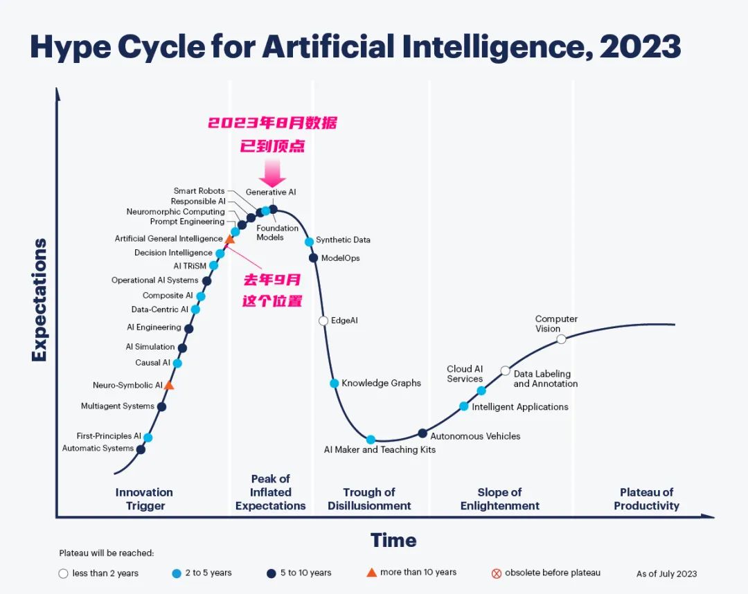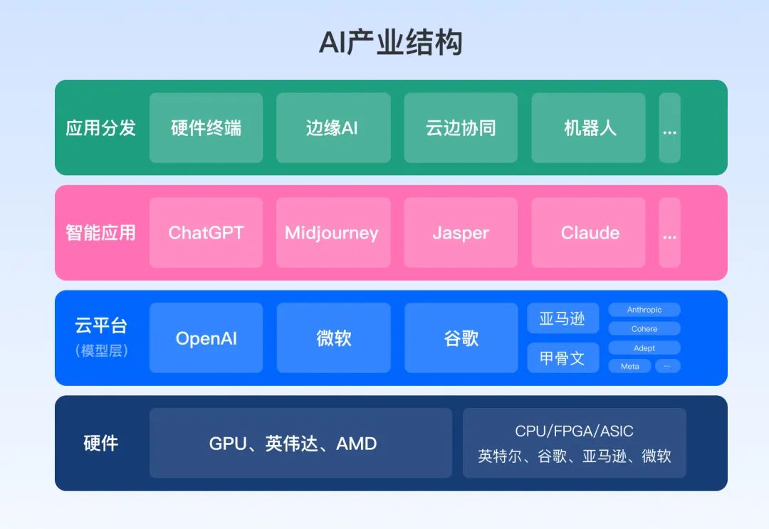 (Gartner每年都会盘点新技术处在哪个阶段,分起步、期望膨胀、破灭、发展几个阶段,以此帮助判断科技产业未来走势)「Gartner」就预测生成式AI已经进入期望膨胀高位,到2023年8月「Gartner」刚发布人工智能技术成熟度曲线,生成式AI从技术萌芽期到技术膨胀期的顶峰,跟过去一段时间AI在学术、产业、资本领域的爆火完全呼应。任何一项新技术成熟发展的必经之路,也可以理解是AI技术融入现实的开始。2、 从产业的结构看,这一轮爆发的机会在智能应用