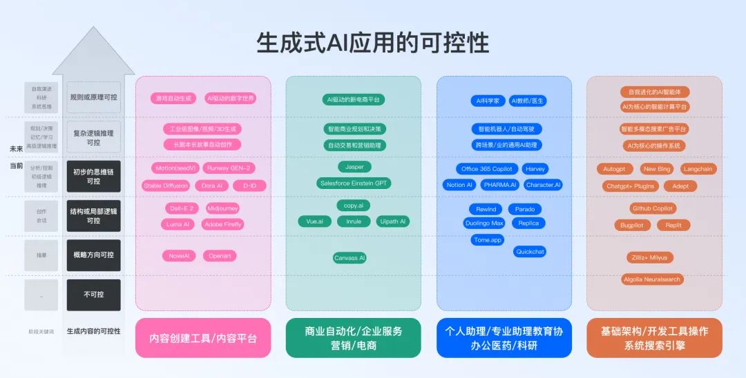 这轮变革最大的机会在应用层面,所以大量涌现出智能应用,比如Stable Diffusion、ChatGPT、Midjourney;以及各行各业基于大模型对AI能力接入,提升自己产品力或服务能力。3、生成式AI在可控性层面的突破