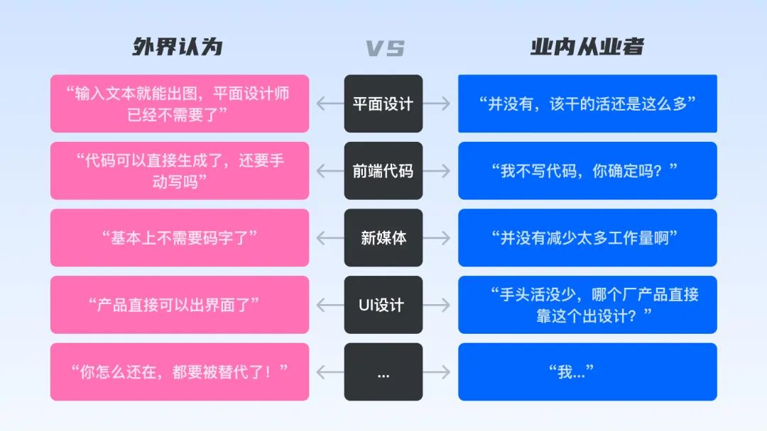 这一轮爆火,除了训练参数的质变,还有一个原因是是“可控度”,即在多个应用领域局部、初步思维上可控,AI可以从随机到可控的生成。市场的期望膨胀、面向用户的智能应用爆发、内容生成可控性的提升,在产业变革的漩涡中,以内容生产谋生的设计师,我们需要了解AIGC到底对设计行业产生了什么影响,到底替代到什么程度了,设计师该如何应对?下面重点聊下这几个话题。#02