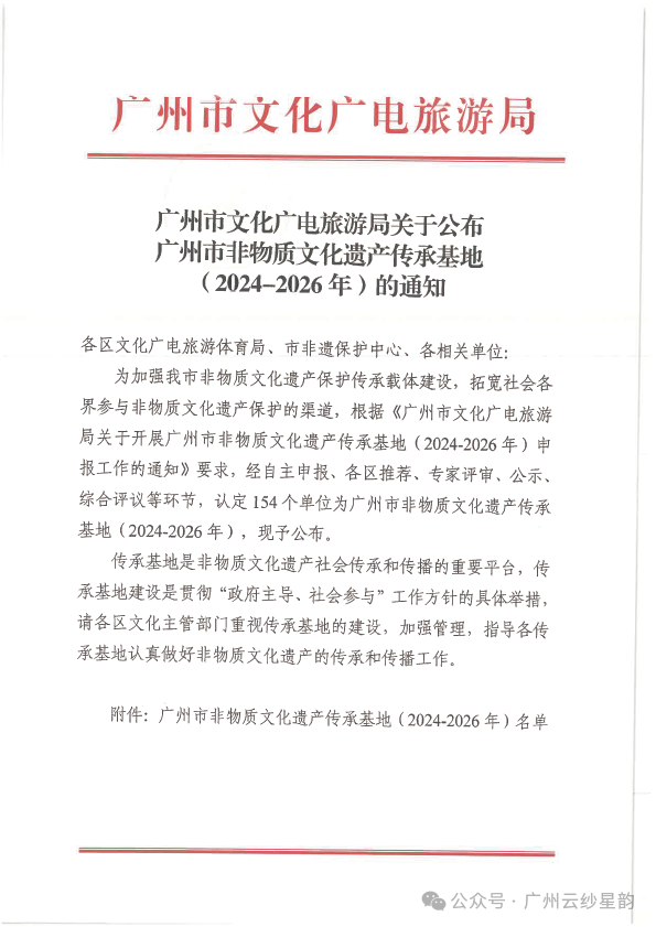 近日,广州市非物质文化遗产保护传承基地(2024-2026)名单正式公布。