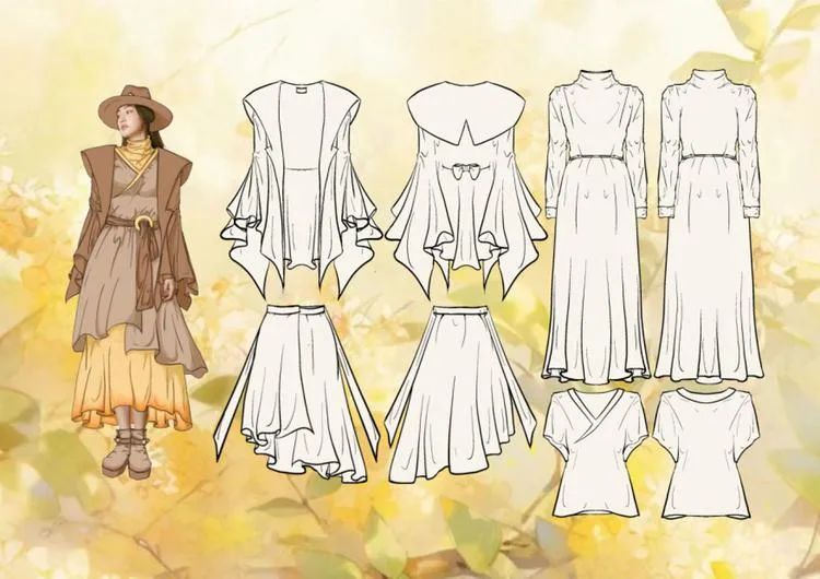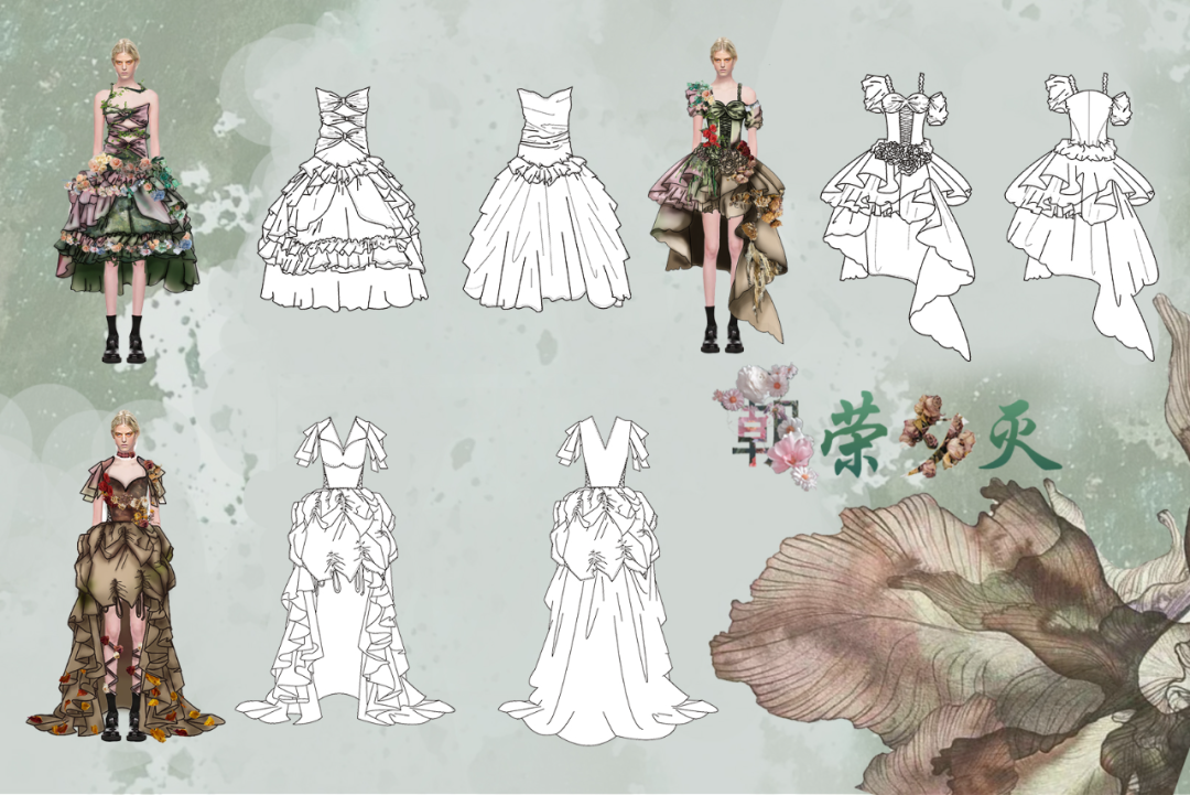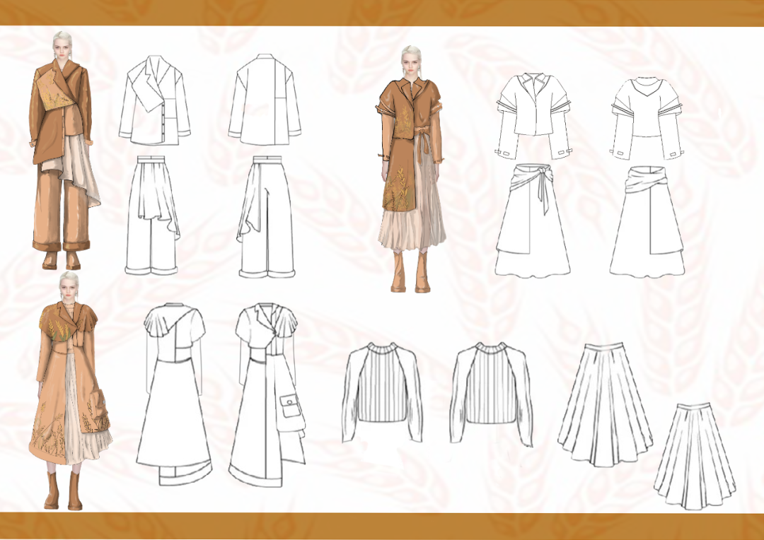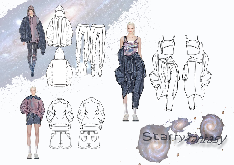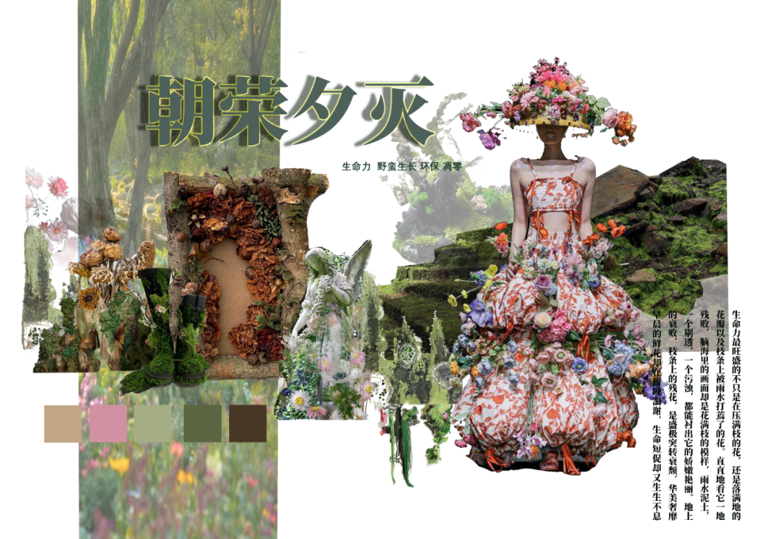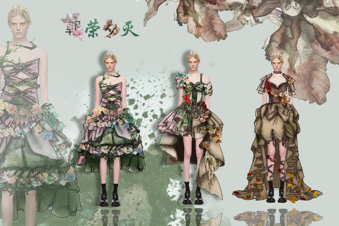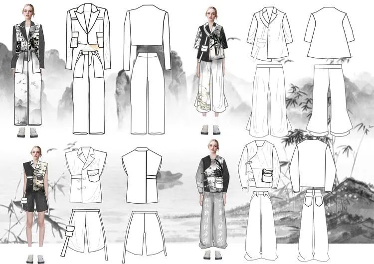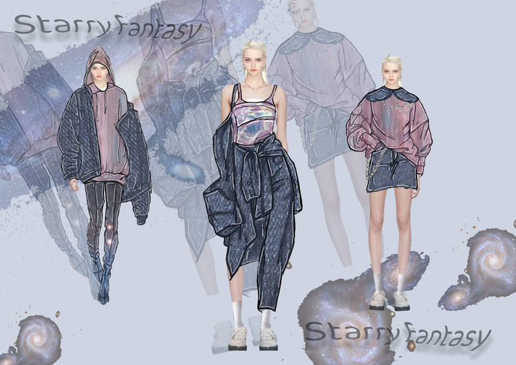 本学期课程大作业以WGSN2024-25秋冬三大流行趋势主题(数字幻境、环保未来、国潮新境)为设计方向,进行主题设计拓展。以下是部分23服设2班的学生作品。