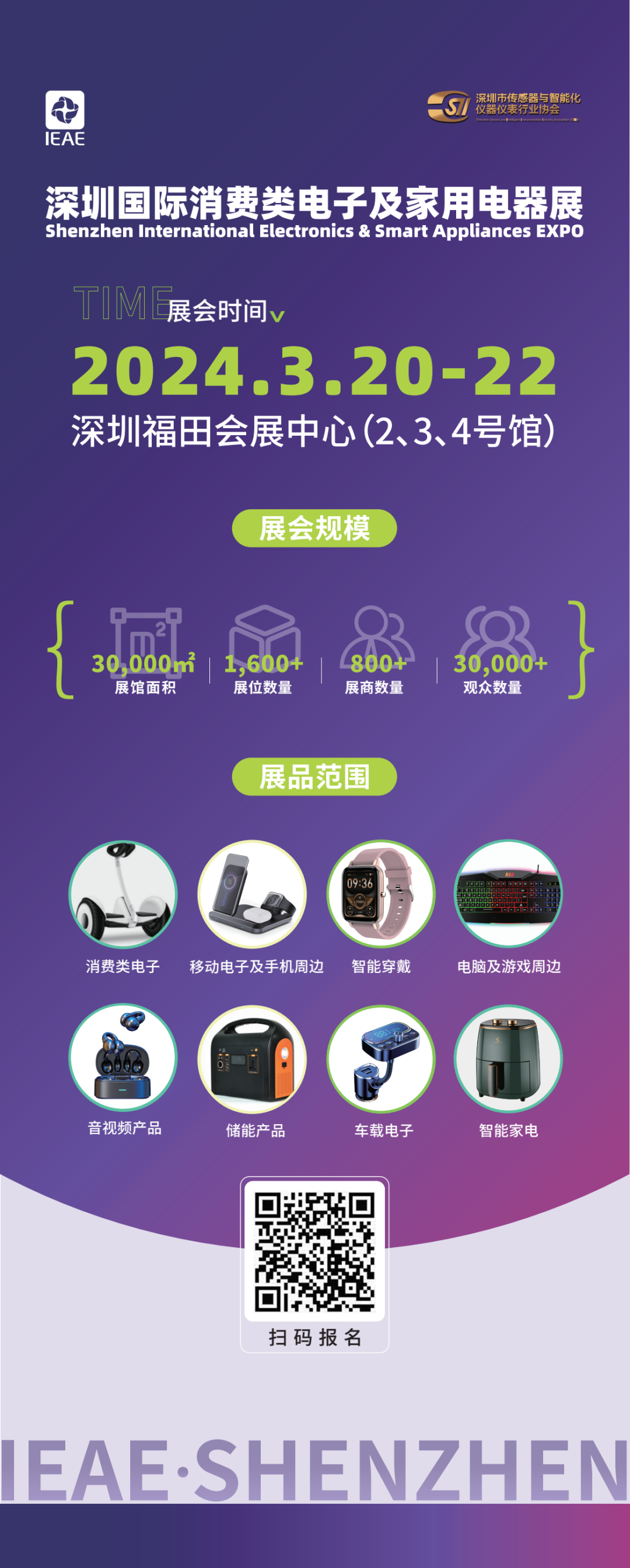IEAE深圳电子展开设三大电子电器展馆,涵盖八大展品范围--消费类电子、音视频产品、智能穿戴、电脑周边及游戏竞技产品、手机及平板电脑周边产品、储能产品、车载电子、智能家电等展品,链接上下游资源,集“产品展示、资讯交流、贸易合作、品牌推广、洞察市场“于一体,为与会观众及企业呈现一个多元丰富的展览平台。