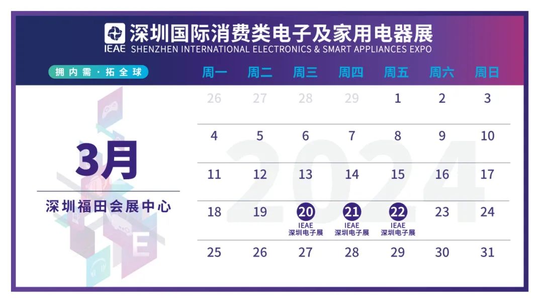 2024年3月20-22日,IEAE深圳国际消费类电子及家用电器展将于福田会展中心拉开帷幕!IEAE系列展会依托丰富的办展经验及影响力已经得到了众多知名协会、品牌企业、媒体业界人士及专业买家的肯定及支持!展会充分汇聚了大湾区丰富的电子电器产业生态资源,致力于为展商及买家搭建专业的采购合作交流平台。