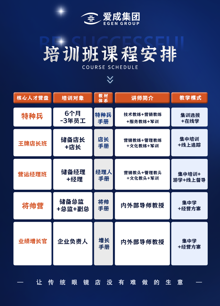 中国眼镜和眼视光行业已进入“拼刺刀式”的竞争阶段,过去的“三板斧”已经无法适应当下的竞争。为了帮助老板们打开格局视野、洞察发展趋势、掌握竞争先机;为了解决企业家在经营管理过程中“没人做”“不会做”“做不好”的问题;为了解决传统连锁眼镜企业的业绩增长难、顾客流失大等问题,爱成集团特别推出《眼镜连锁企业业绩增长官》特训营招募计划以及《企业经营全托管》方案,诚邀您2024年3月11-13日莅临爱成集团展位:H3馆3S16-3T17,合作共赢。
