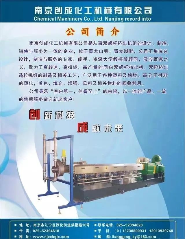 南京创成化工机械有限公司是从事双螺杆挤出机组的设计、制造销售与服务为一体的企业,位于青龙山旁,青龙湖畔,公司汇集多名设计,制造与服务的专家,能手,资深大学教授做顾问,吸收百家之长,致力于高转速,高扭矩,高产量的同向双螺杆挤出机,双阶挤出造粒机组的制造及相关工艺,广泛用于各种塑料及橡胶,高分子材料的塑化,着色,填充,增强,母粒及相关物料的回收利用。