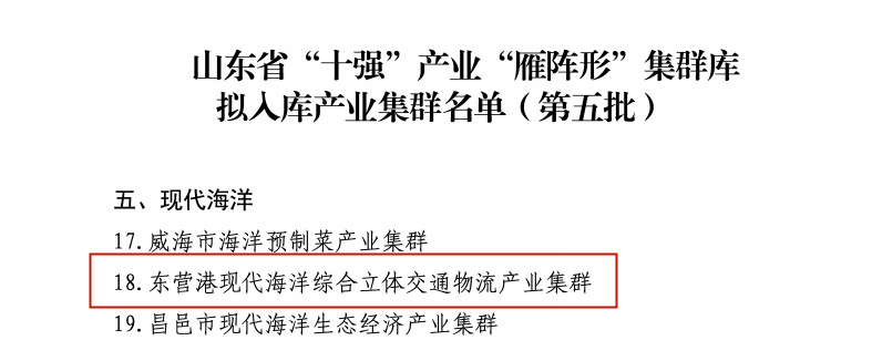 6月19日,山东省发展和改革委员会对2023年度拟入库培育的“十强”产业“雁阵形”集群进行公示,东营港现代海洋综合立体交通物流产业成功入选。这是我区连续三年获得的第三个“十强”“雁阵形”集群,我区成为全省首个高端化工、新材料、现代海洋领域“雁阵形”产业集群开发区。