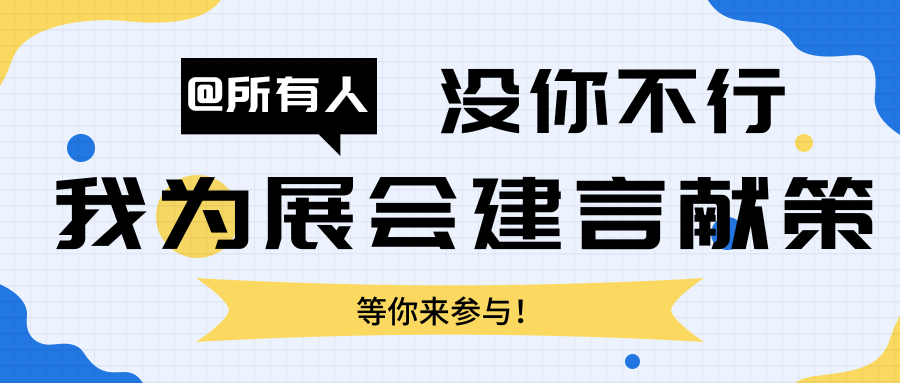 您的每一条意见建议,都将被认真对待。我们会将大家的意见建议汇总整理,深入研究,合理采纳。一经采纳,将给予奖励。真诚期待您为展会建言献策!
