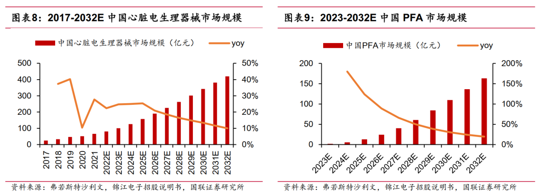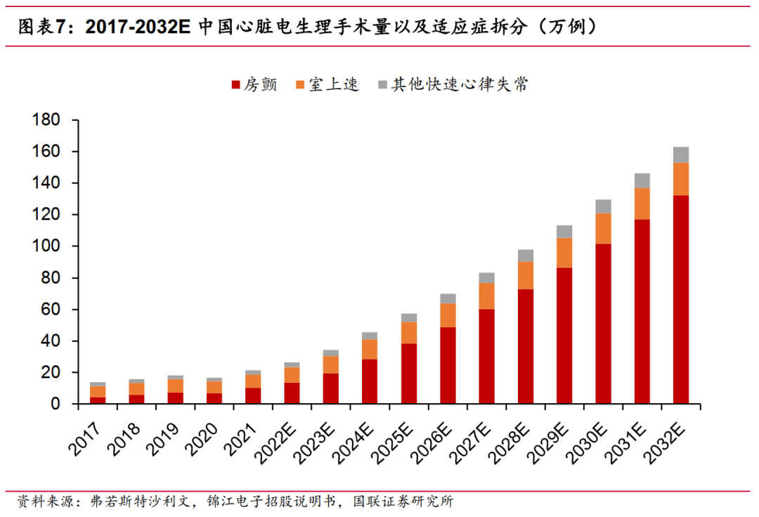 根据弗若斯特沙利文报告, 2021 年中国心脏电生理手术量达到 21 万例, 2017-2021 年 CAGR 为 11.60%。随着人口老龄化程度加剧、患者人数不断增加、就医条件逐渐便利,手术量实现持续增长,预计 2025 年将达到 57 万例,期间 CAGR 为28.00%。随着 PFA 等新兴消融技术逐步推广,中国心脏电生理手术量将进一步增长,预计到 2032 年将达到 163 万例, 2025-2032 年的 CAGR 为 16.06%。