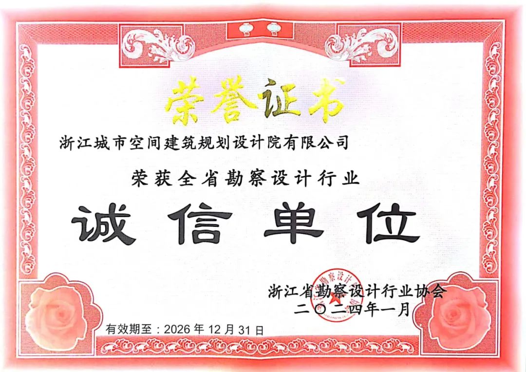 日前,浙江省勘察设计行业协会发布了《关于公布浙江省勘察设计行业诚信单位名单的通知》浙设协[2024]7号文,浙江城市空间建筑规划设计院有限公司被授予“诚信单位”称号。