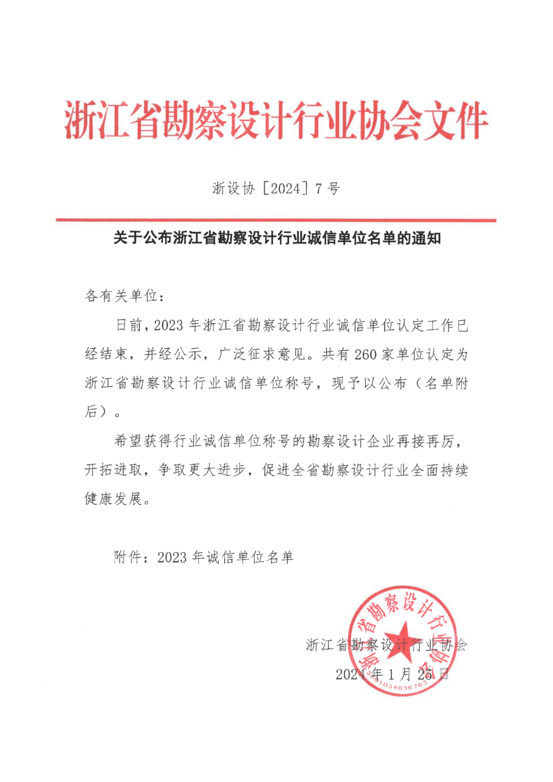 抱诚守真 | 我院荣获浙江省勘察设计行业诚信单位