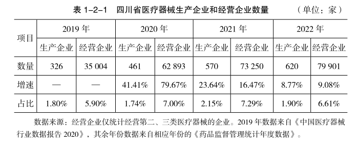近年来,四川省医疗器械生产企业和经营企业数量表现出良好的增长态势。如表1-2-1所示,2019年,生产企业为326家,到2022年增长至620家。其中,2020年和2021年同比增长分别为41.41%和23.64%,2022年同比增速回落到8.77%。生产企业数量占全国的比重从2019年的1.80%提高到2021年的2.15%,之后在2022年回落到1.90%。