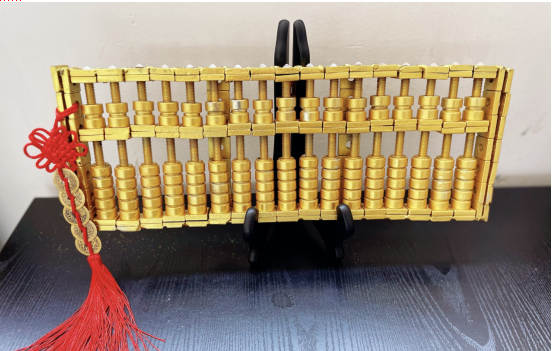 本作品是由200多个螺母和螺丝组合成的,100%紧固件纯手工打造的,算盘上的每个珠子都是可以活动的,整体线条流畅。算盘的寓意和象征是多方面的,它是我国古代的计算工具,一直被人们视为招财进宝的象征,因此算盘寓意着财源广进,财运滚滚。其次还有精打细算,运筹帷幄的寓意,更象征着财富和地位。