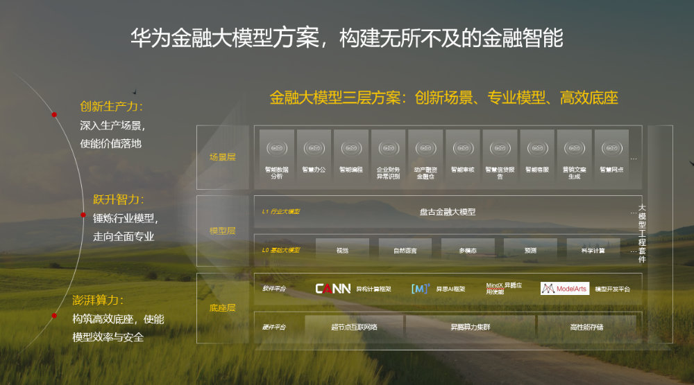 华为金融大模型解决方案,包括场景层、模型层、底座层。以高质量的数据为基础,通过三层方案加速创新生产力、跃升智力、澎湃算力三力协同,逐步实现场景的价值落地、体系构建、能力固化。