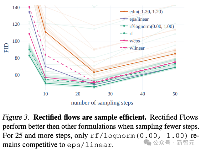 通过与其他60种扩散轨迹(例如 LDM、EDM 和 ADM)进行比较,作者发现尽管之前的RF方法在少步骤采样中表现更佳,但随着采样步骤增多,性能会慢慢下降。