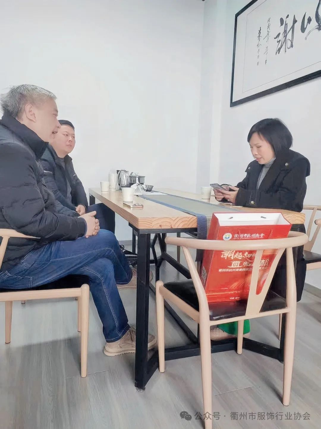 衢州市联通总经理吴敏带着浙江省服装大脑衢州地区负责人姜斌和他的助理拜访衢州市服饰行业协会,与衢州市服饰行业协会会长沈菊香洽谈