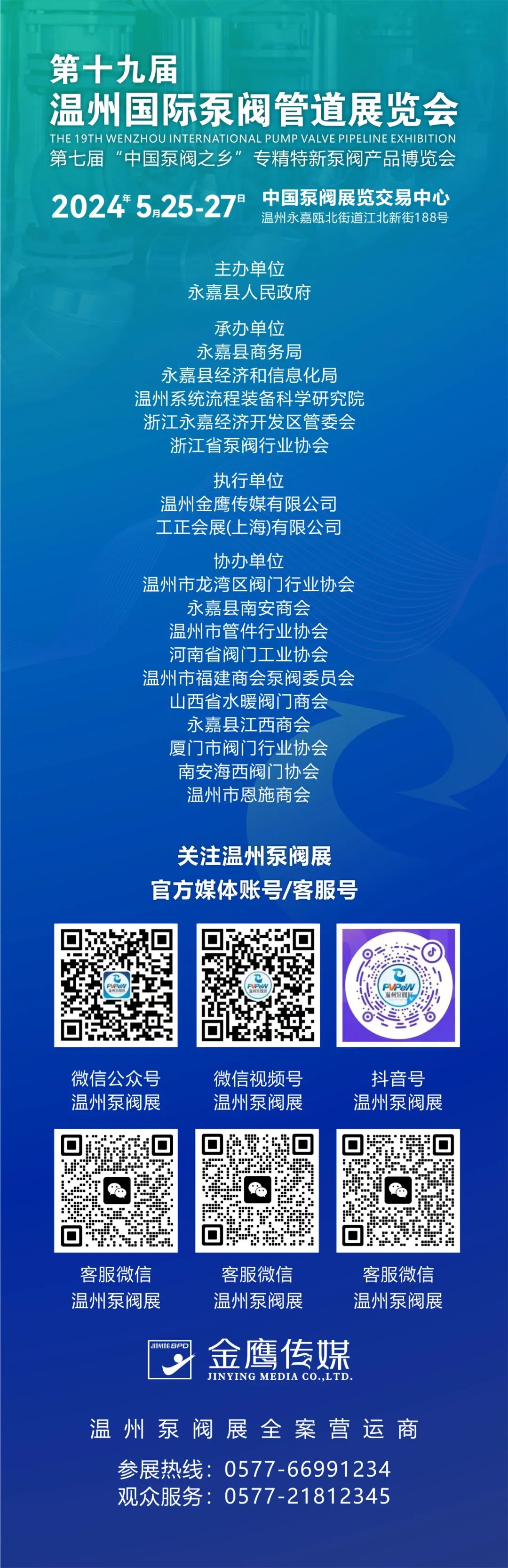 聚焦中国泵阀之乡,汇聚泵阀行业力量!开创泵阀行业新趋势、新业态、新机遇,立体呈现行业“质”造,共赢未来。温州目前已成为全国规模最大、企业集中度最高、产品品类规格最全的泵阀生产基地,入选工信部首批中小企业特色产业集群,温州将坚持创新第一动力,聚焦泵阀产业高质量发展,抢抓新机遇,持续塑造新优势。为进一步“提升泵阀产业,助力外贸业态发展”,共商优化营商环境新思路,助推温州永嘉阀门新发展,第十九届温州国际泵阀管道展览会、金鹰泵阀展将于2024年5月25-27日在中国泵阀展览交易中心盛大启幕!本届展会展出面积25000㎡,展位900+,展出阀类、泵类、管道、执行机构、机械设备、配件、气动元件等上万种产品。