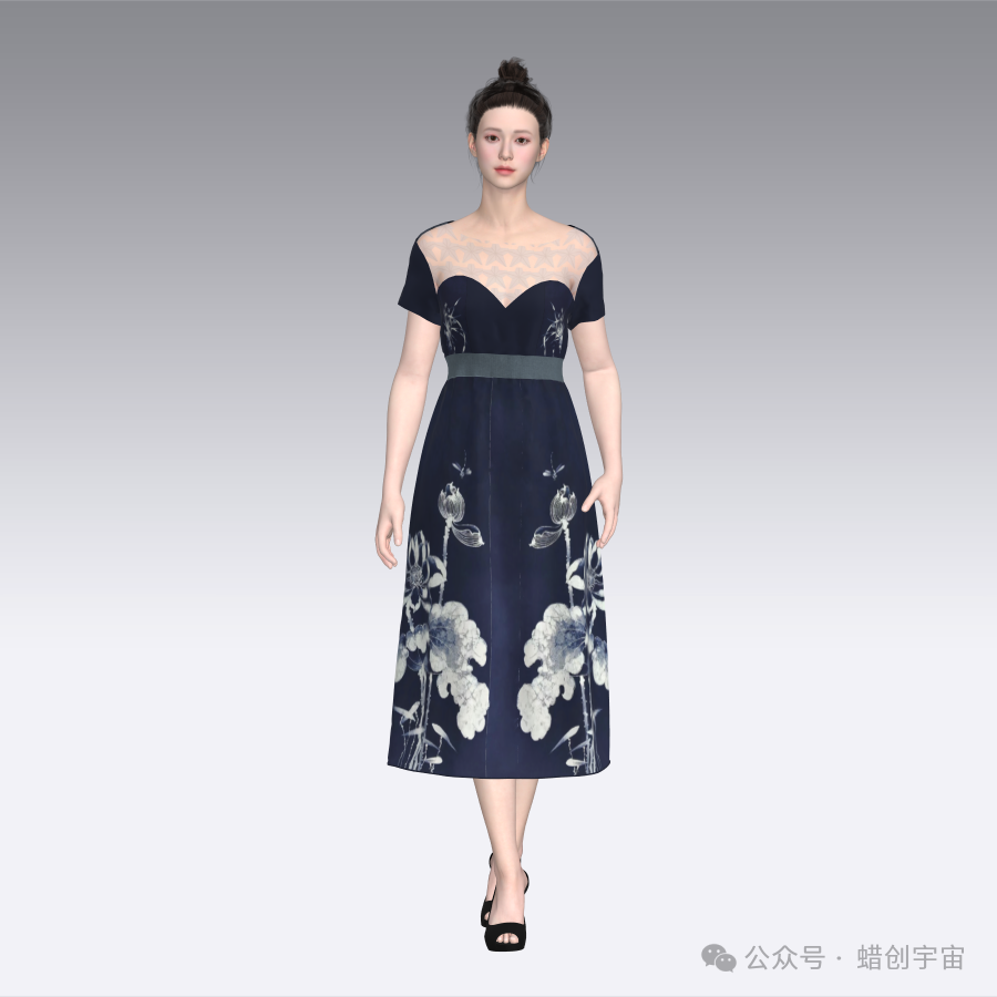 第一款如图,裙身两侧运用蜡染设计图案,图案成中轴对称,正是体现中国传统文化的整齐对称之美,摸胸的设计与腰部收腰设计无一不彰显女性优美的身体线条,胸前镂空的设计不乏美感,整体彰显落落大方的东方美感。