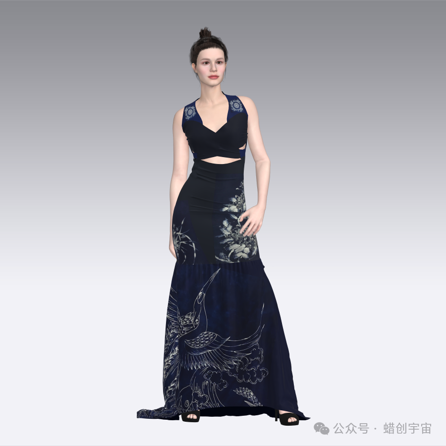 第二款是镂空露腰设计,下身裙摆先是包臀设计,将女性的优美曲线展现的淋漓尽致,紧接着散下裙摆,给人一种热烈洒脱之感,裙摆的白鹤飞天图是中国古老神话中的人物,正是体现了中华民族的特点以及国人豪迈洒脱的性格,裙装整体带有一丝丝辣妹风格,符合现代人的新潮审美,十分耐人寻味。