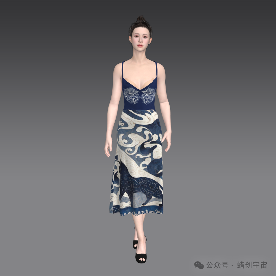 最后一款服装,运用吊带裙设计,将女性肩部完美展现,裙身的的图案十分特别,环绕的花纹显得整体十分落落大方,与中华传统美德相得益彰,具有深远意义。