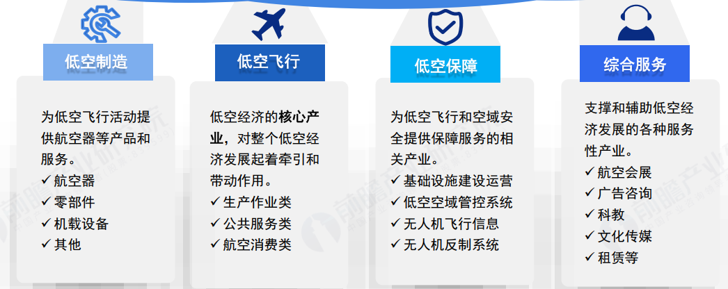 低空经济包括多种航空器的制造、飞行、保障和综合服务。制造环节包括航空器、零部件、机载设备和其他部门的制造;飞行环节对整个低空经济发展起着牵引和带动作用,根据使用的场景,可以分为生产作业类、公共服务类和航空消费类;保障环节为低空飞行和空域安全提供保障服务的产业,包括基础设施建设运营、低空空域管控系统、无人机飞行信息、无人机反制系统等;综合服务是支撑和辅助的服务性产业,包括航空会展、广告咨询、科教、文化传媒和租赁等。因此,低空经济是辐射带动效应强、产业链较长的综合经济形态。