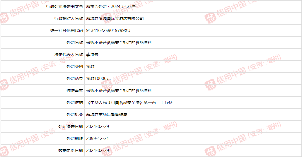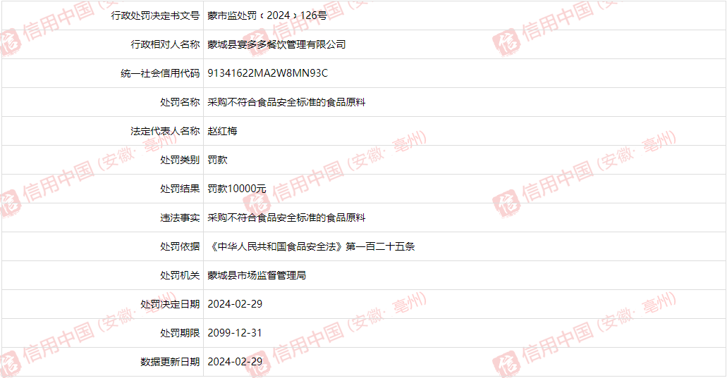 蒙城县市场监督管理局公布了对两家餐饮企业的处罚公示:
