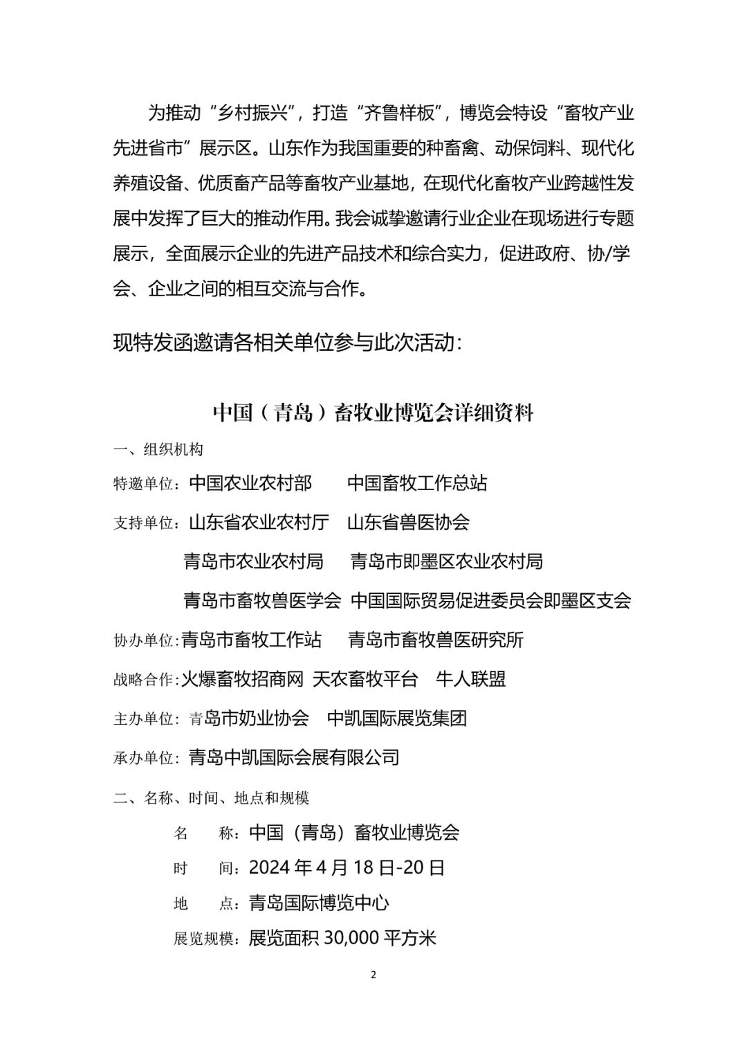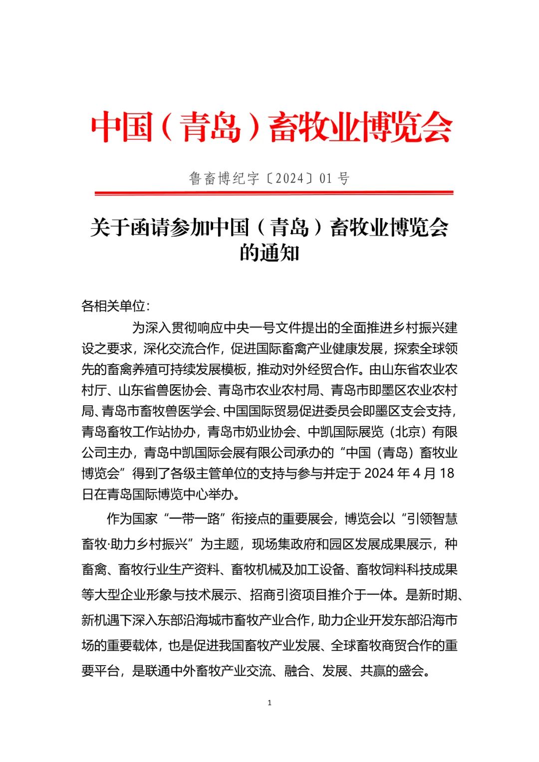 为深入贯彻响应中央一号文件提出的全面推进乡村振兴建设之要求,深化交流合作,促进国际畜禽产业健康发展,探索全球领先的畜禽养殖可持续发展模板,推动对外经贸合作。山东省兽医协会决定组团参加青岛中凯国际会展有限公司承办的“中国(青岛)畜牧业博览会”。会议定于2024年4月18日在青岛国际博览中心举办。