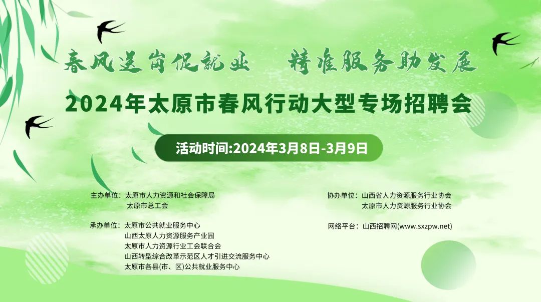 2024年3月8日、3月9日,太原市人力资源和社会保障局、太原市总工会将在山西太原人力资源服务产业园连续2天联合举办以“春风送岗促就业 精准服务助发展”为主题的2024年太原市春风行动大型专场招聘会。