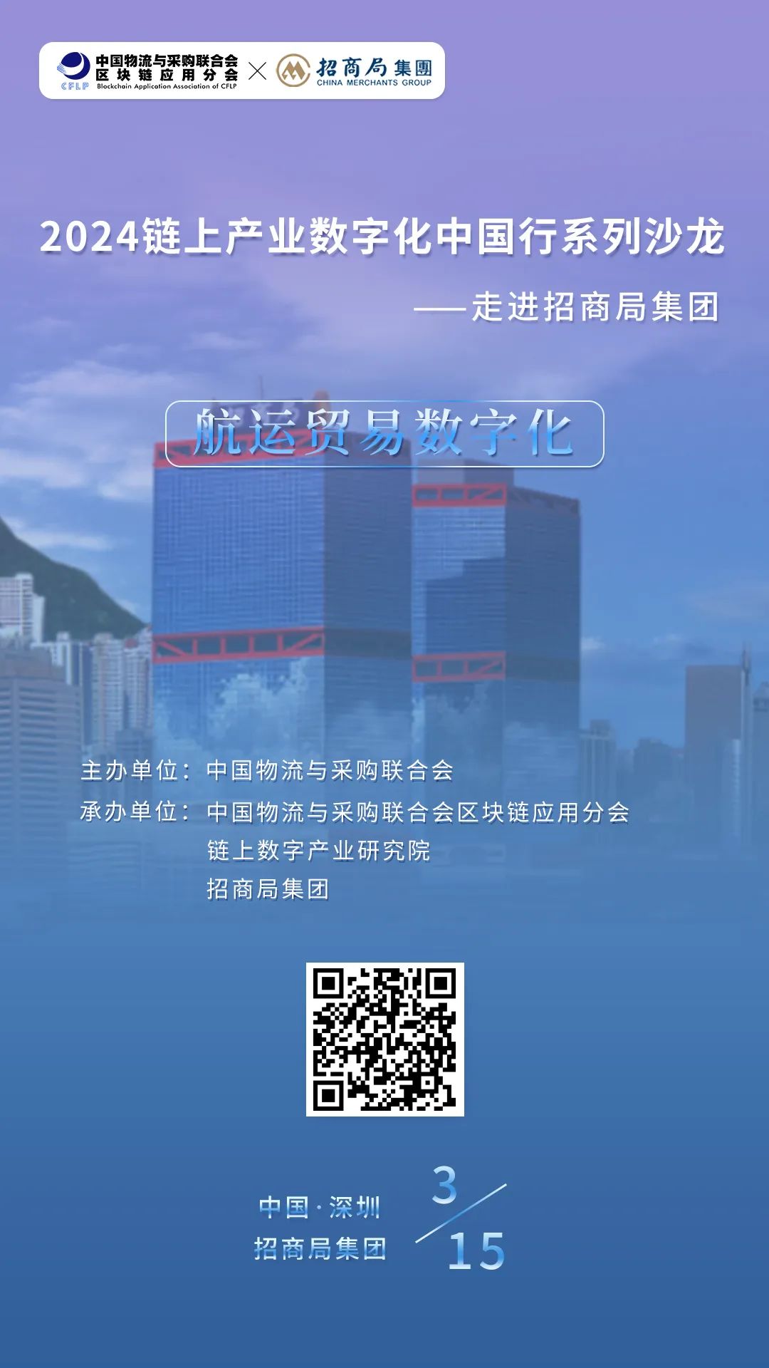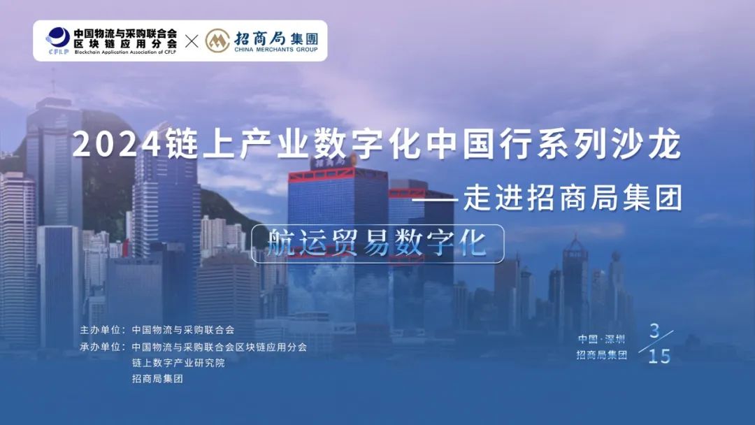 为了贯彻落实相关政策精神,聆听行业声音,学习标杆企业先进经验,中国物流与采购联合会区块链应用分会、链上数字产业研究院等单位决定于3月15日在深圳举办“2024链上产业数字化中国行系列沙龙——走进招商局集团”活动。