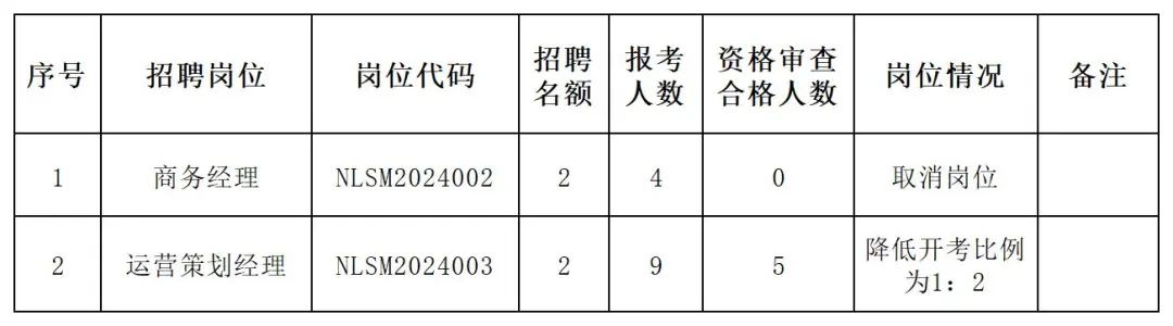 根据各岗位的报名情况及资格审查情况,经用人单位研究决定降低部分岗位开考比例,取消部分岗位,取消岗位的报考者不调剂。详细情况如下: