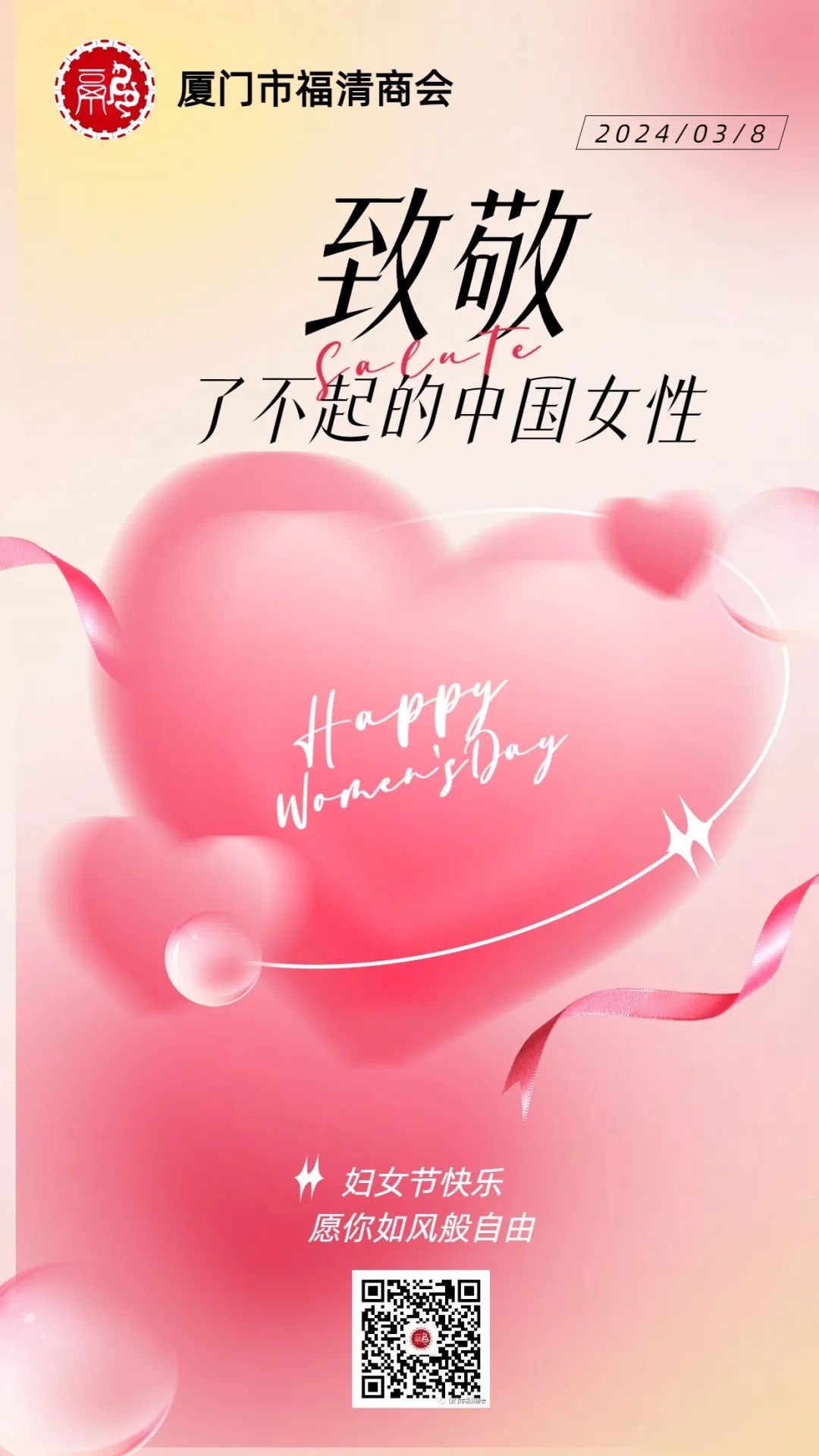 在这春暖花开的时节,我们迎来了国际妇女节,一个属于所有女性的特殊日子。厦门市福清商会全体成员,向所有女性朋友们致以最热烈的祝贺和最诚挚的祝福!女性,是社会的半边天,是家庭的温暖港湾。她们以柔弱的肩膀,承载着家庭的重担;她们以坚韧的意志,书写着人生的华章。无论是在职场上的拼搏奋斗,还是在家庭中的默默付出,女性都展现出了无比的智慧和力量。