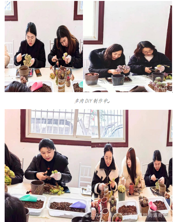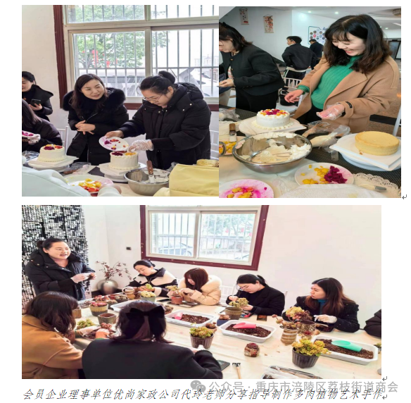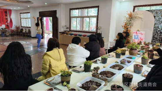 万物复苏春风暖,巾帼逐梦绽芳华。3月7日下午,荔枝街道商会党委联合中铁一局渝万项目党支部在禾黍小院开展“党建聚合力,巾帼绽芳华”纪念第114个“三八”国际妇女节主题活动,共同庆祝“三八”国际妇女节。商会党委书记彭丰苏、会长薛刚,中铁一局渝万项目部党支部书记党新红出席活动,商会及一局渝万项目部20余名女性职工代表参加本次活动。活动开始前,商会党委副书记余鹏飞向在场的全体女同胞致以节日问候和美好祝愿,鼓励大家发扬新时代巾帼不让须眉、妇女能顶半边天的光荣使命,保持昂扬奋进的精神,用勤劳和智慧奋力为企业发展和家庭建设贡献巾帼力量。本次活动在烘焙“食光”中拉开了序幕,大家在专业烘焙老师的带领、协助下,将蛋糕胚分开,铺上一层鲜果、一些坚果,再将裱花袋中的奶油挤到蛋糕胚上,最后点缀上水果,一个个内料丰富,外表可爱的小蛋糕就制作完成了。优尚家政公司的代玲玲老师向大家介绍了多肉植物知识,分享了她多年的多肉植物培栽经验,同时指导大家培栽多肉盆景,互学互鉴,充分展示了女性心灵手巧、匠心独运。最后形体艺术老师为大家带来了一场高质量的形体授课,大家在欢声笑语中,共沐和煦春风,共同交流分享工作生活。据悉,商会党委班子下一步将釆取轮值统筹牵头负责模式,丰富活动形式、凝聚广泛共识,持续推进以高质量党建统领服务型商会建设,争创红岩先锋变革型基层商会。