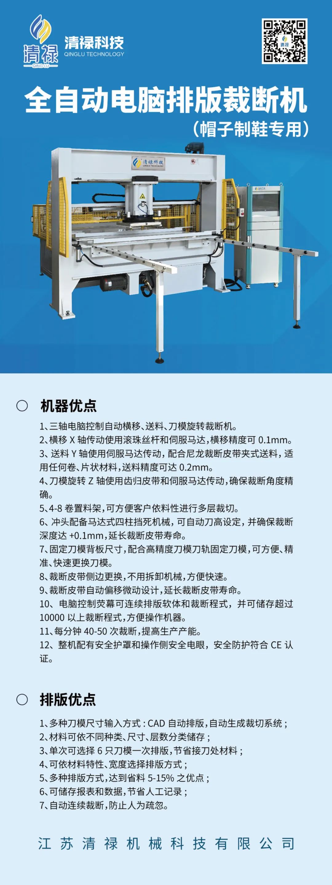 自动裁床,全自动电脑排版裁断机,数控油压龙门旋转头裁断机, 伺服拉布机, 智能型输送带循环式模切机.