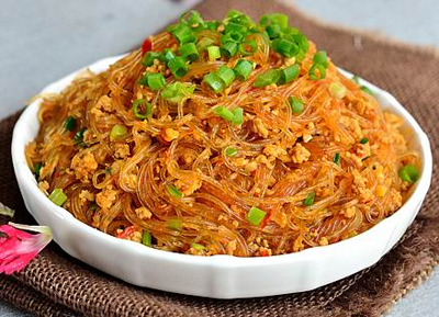 红米饭、蚂蚁上树、蒜香儿菜炒肉