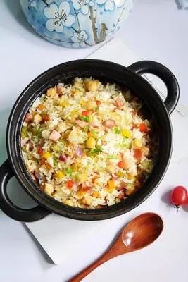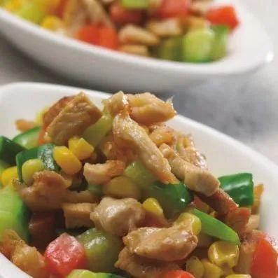 小米饭、翡翠鸡丁、金玉蝴蝶虾