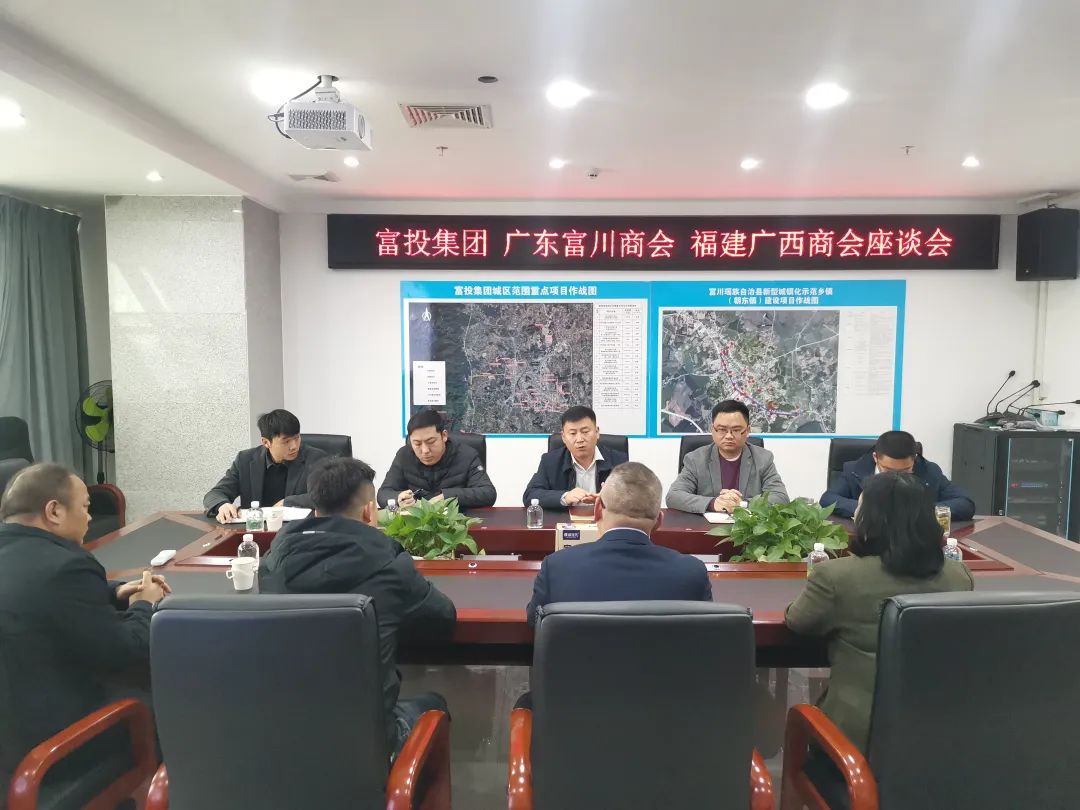 富投集团、广东富川商会、福建广西商会工作交流座谈会在富投集团召开,富投集团董事长戚闯,总经理张桉华,副总经理杨永参加会议。
