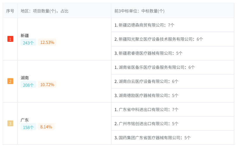 2、【全国】【医疗设备】 项目数量 TOP3 地区的重点中标单位;